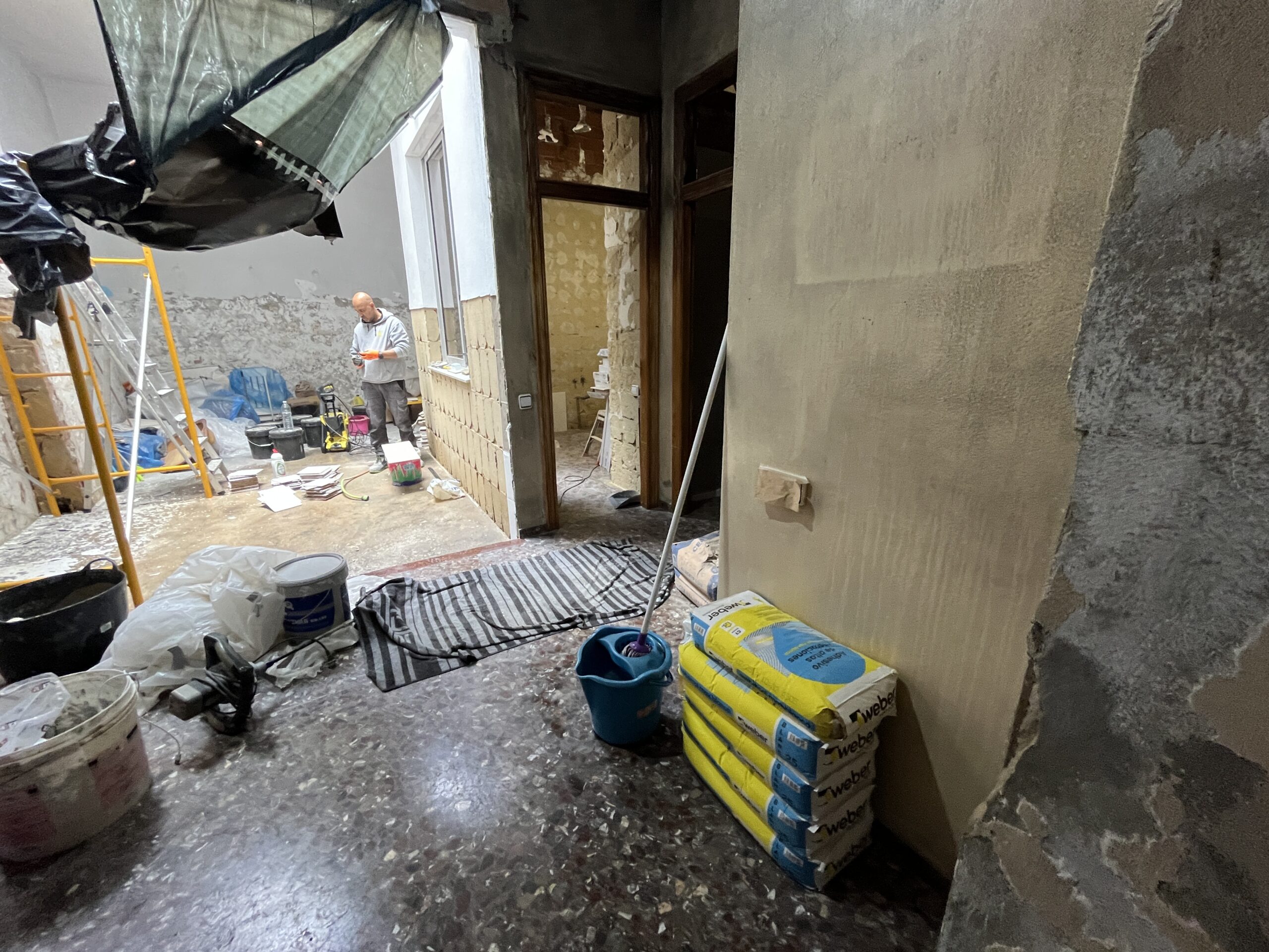 Debido a la falta de las instalaciones en cocina, el desprendimiento de revestimientos y la falta de techos de techos de escayola dejando expuestas las instalaciones eléctricas esta vivienda carece de las condiciones mínimas de habitabilidad por lo que nuestra actuación se centrará en el seguimiento de las actuaciones por parte del afecado del desescombro y retirada de revestimientos, adecuación de la cocina, baños y falsos techos restaurar la funcionalidad y apariencia de los elementos afectados. Desde la perspectiva del diseño interior y la habitabilidad, se proponen las siguientes intervenciones:
